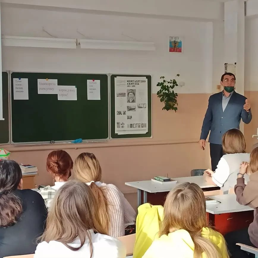 В рамках марафона "День башкирского языка" учитель башкирского и родного языка Ярышев З.С. провёл уроки в 8,10,11 классах, в ходе которых учащиеся прослушали лекции-выступления учёного К.Кунафина и познакомились с биогрфией поэта- импрвизатора М.Акмуллы.