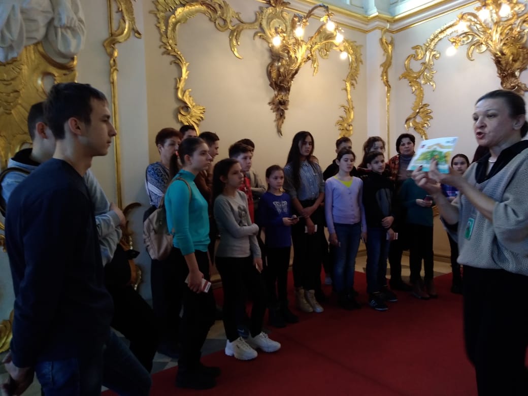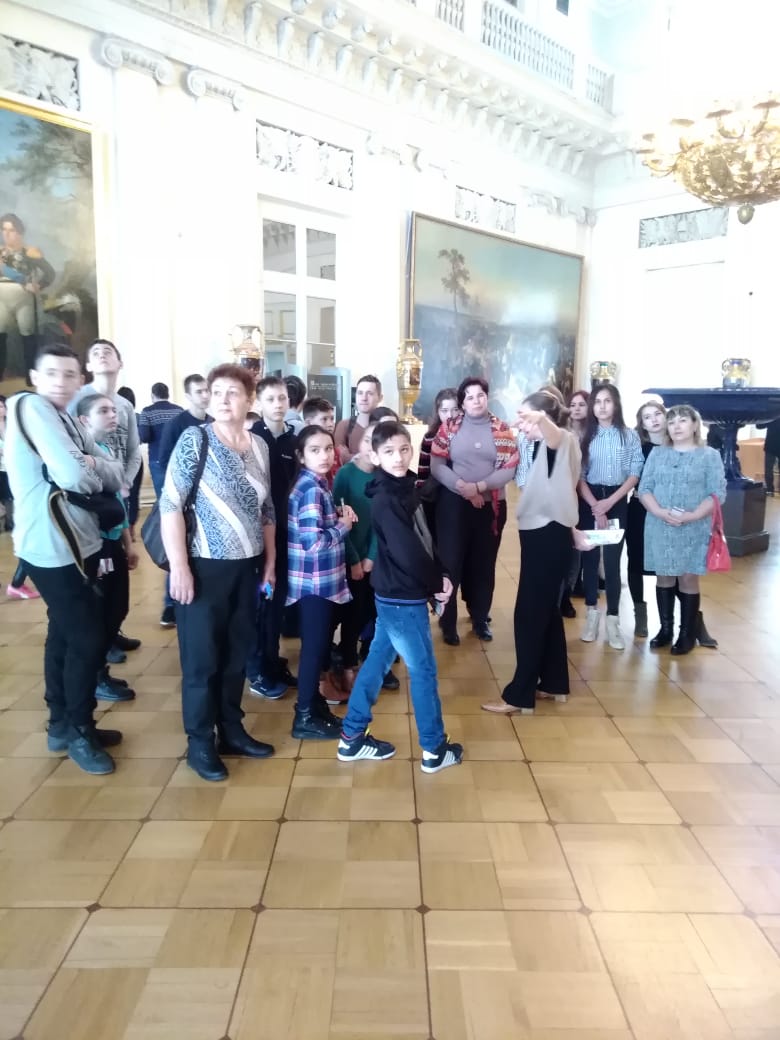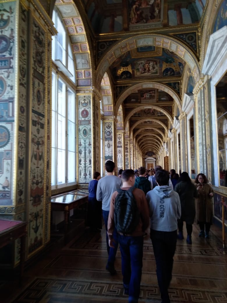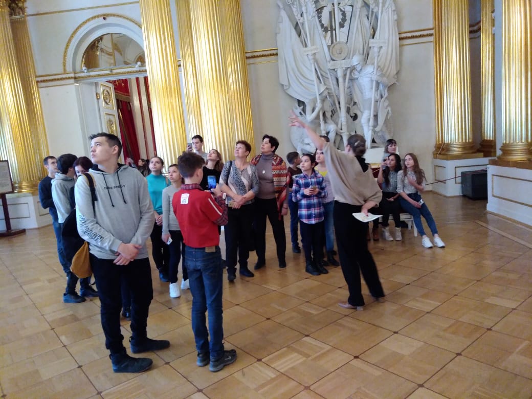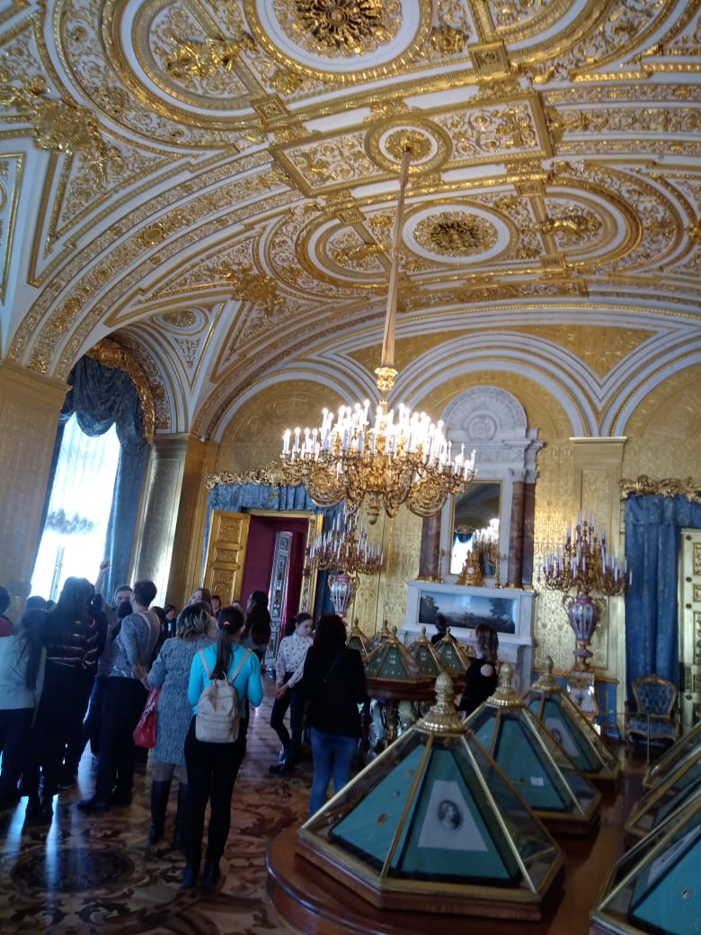 В Эрмитаже нас встретила обаятельная экскурсовод. От нее мы узнали, что датой основания Эрмитажа принято считать 1764 год, когда императрица Екатерина II приобрела большую коллекцию картин иностранных художников. Она основала небольшой музей, в котором любила проводить часы в уединении, и назвала этот музей «Эрмитаж» (с французского ermitage – место уединения, хижина отшельника). Сейчас это самый посещаемый музей города: ежегодно более 3 млн. гостей знакомятся с его выдающимися коллекциями. Много залов, огромная территория. Огромное количество картин, экспонатов, скульптур. Говорят, что если смотреть на каждую картину по три минуты, то на это уйдет 7 лет.